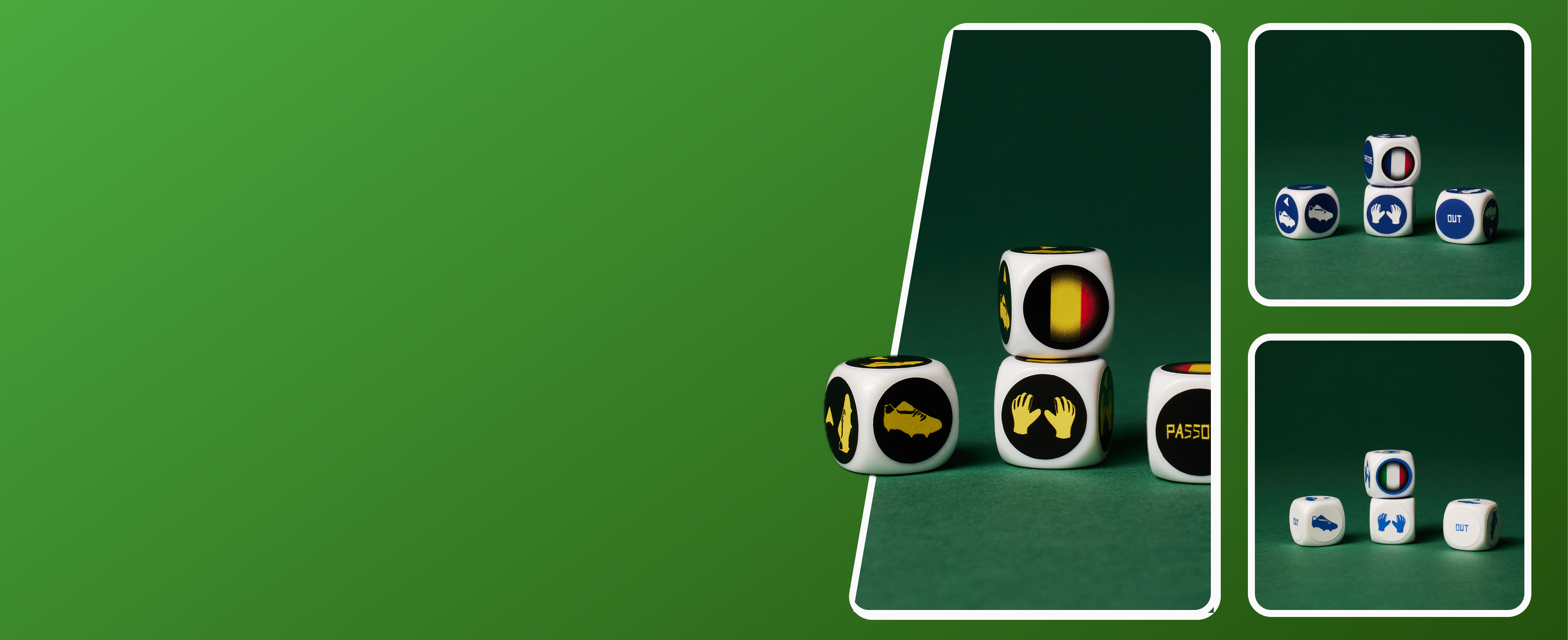 Invitez vos plus proches rivaux pour une soirée jeux sur le thème du foot qu'ils n'oublieront jamais. Créez et organisez des phases finales avec nos jeux de dés de foot. Déjà, plus de 10 grandes nations du football sont disponibles pour nos jeux de dés, dont l’équipe de France. Les autres pays arriveront bientôt !