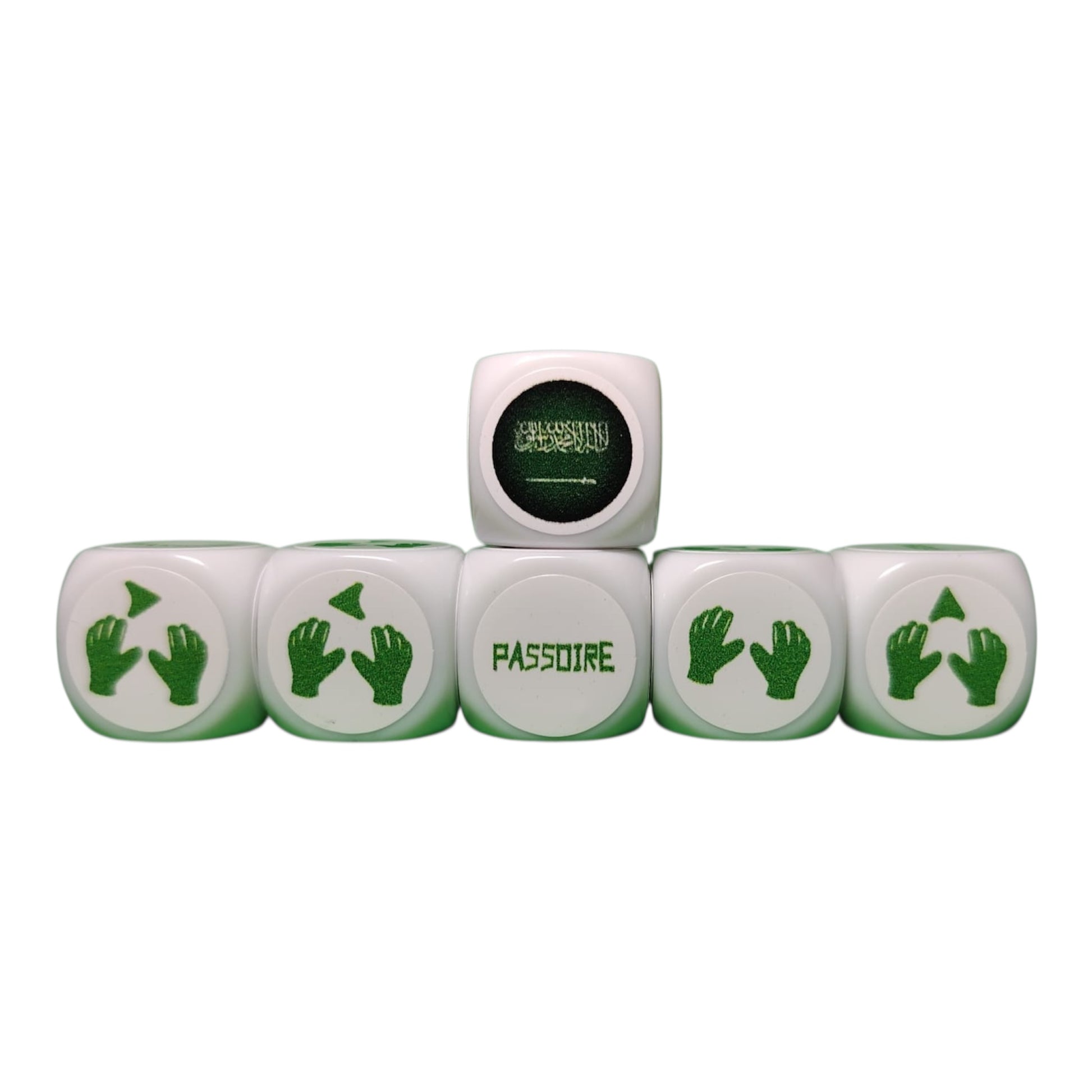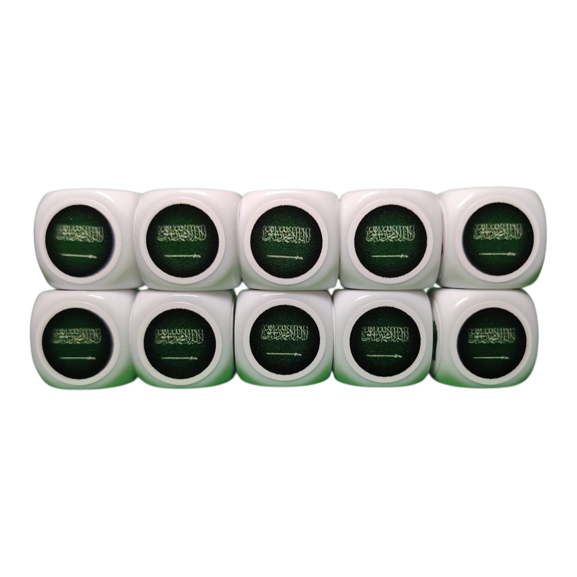 - 5 shooting dice and 5 goal dice on white dice in the colors of Saudi Arabia